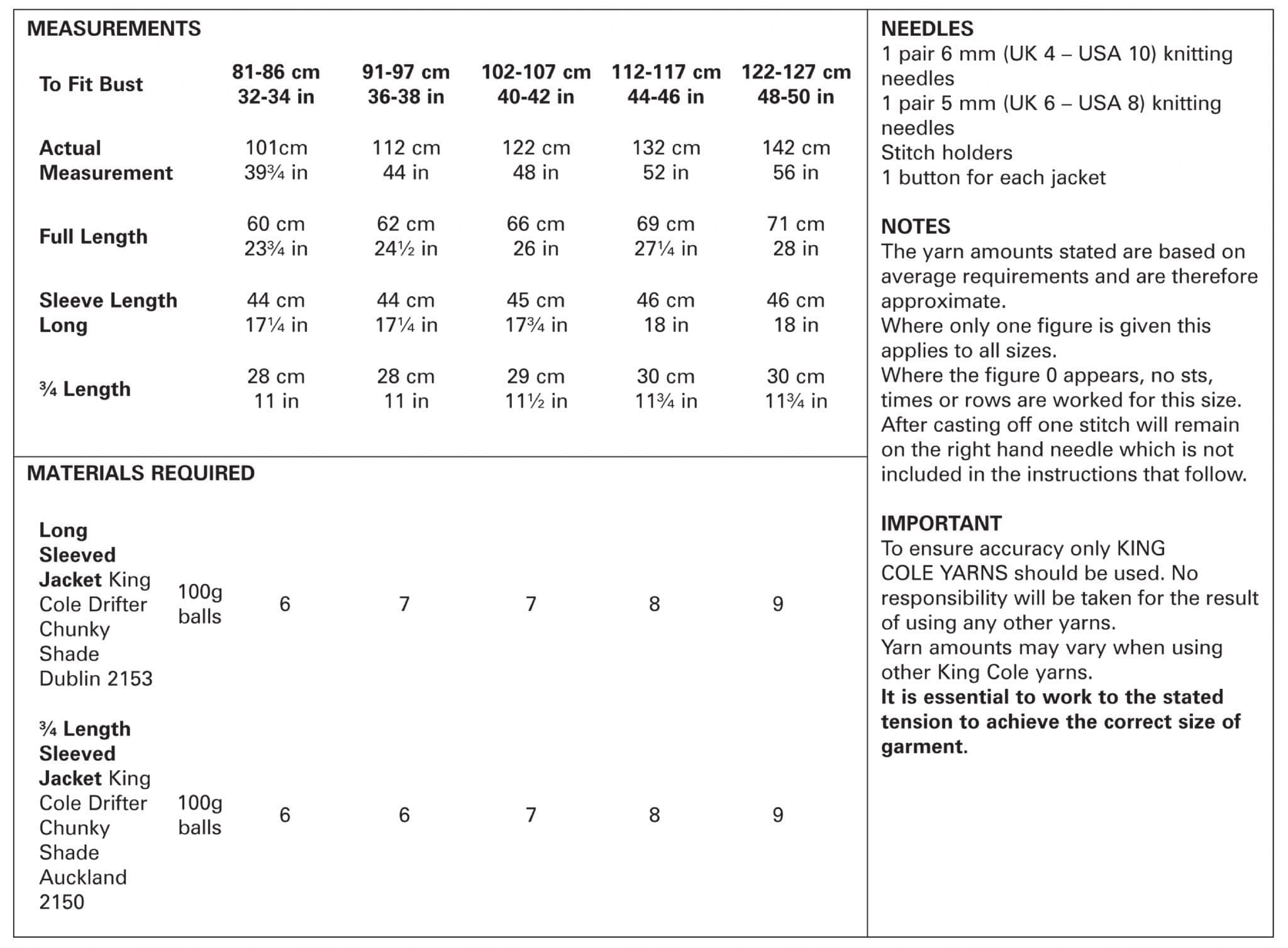 King Cole Ladies Chunky Patterns Home / Knitting Patterns / King Cole Patterns / King Cole Ladies Chunky Patterns / King Cole Drifter Chunky Knitting Pattern - Jackets 4597 King Cole Drifter Chunky Knitting Pattern - Jackets 4597 King Cole Drifter Chunky Knitting Pattern - Jackets 4597 £3.29 In Stock: 0 You Will Earn 3 points with this purchase Free Delivery on orders over £25 Need a hand? Call Us Order before 2PM for same day dispatch Sorry this item is out of stock Add to your Wish List Description Size: 81/86 - 122/127cm 32/34 - 48/50in Needle Sizes: 1 Pair of 6mm(UK4) Knitting Needles 1 Pair 5mm(UK6) Knitting Needles Stitch Holders 1 Button for each jacket See image provided for the number of balls of wool required for each garment and the colours that are illustrated in the leaflet. King Cole knitting pattern using Drifter Chunky yarn. Reviews Customer reviews No reviews left yet Write a review Sort byMost RecentTop Rated No reviews have been left for this product, be the first to leave a review Attributes GTIN: 5015214224383 Brand: King Cole Product Code: 5015214224383