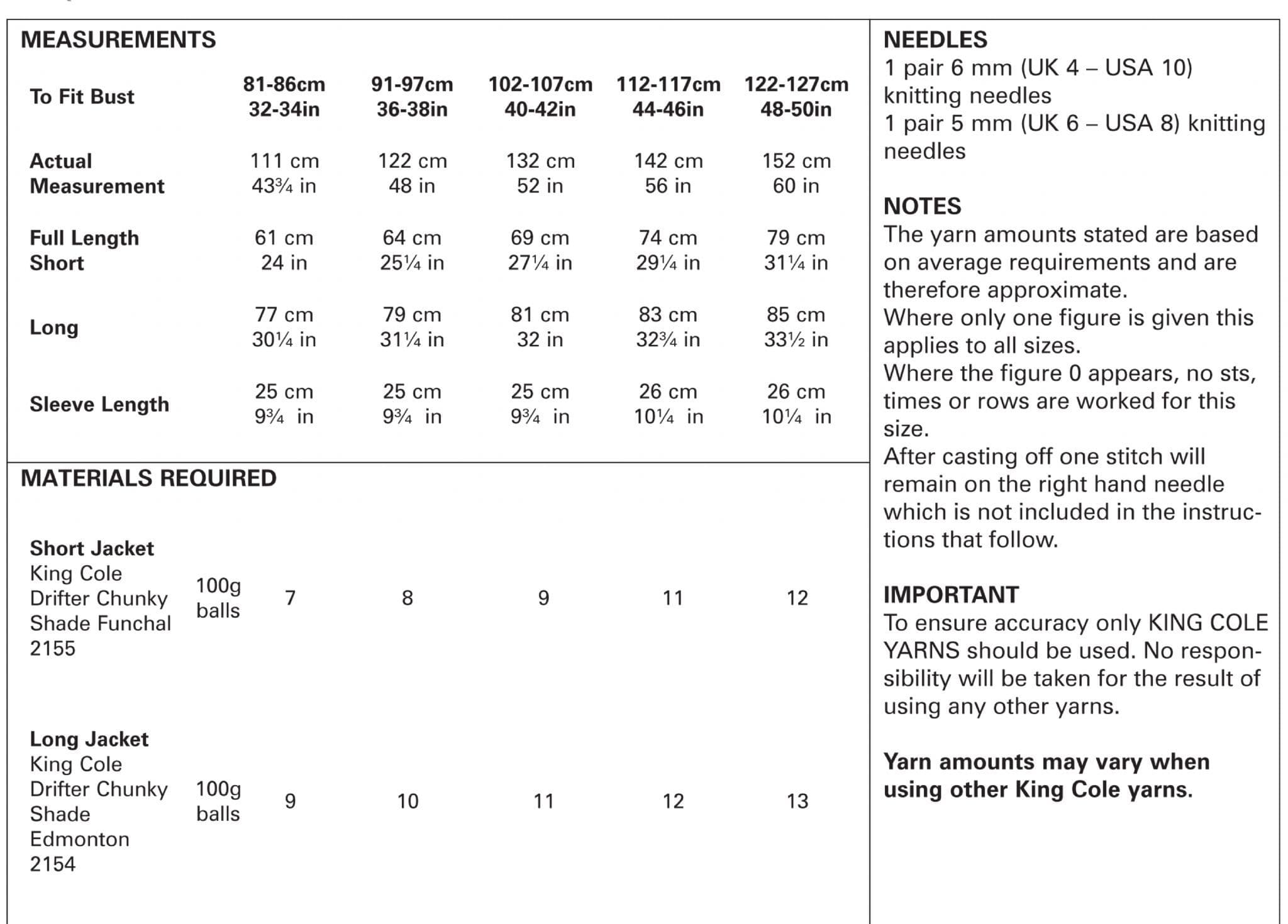 King Cole Ladies Chunky Patterns Home / Knitting Patterns / King Cole Patterns / King Cole Ladies Chunky Patterns / King Cole Ladies Jackets Knitted with Drifter Chunky 4603 King Cole Ladies Jackets Knitted with Drifter Chunky 4603 King Cole Ladies Jackets Knitted with Drifter Chunky 4603 £3.29 In Stock: 0 You Will Earn 3 points with this purchase Free Delivery on orders over £25 Need a hand? Call Us Order before 2PM for same day dispatch Sorry this item is out of stock Add to your Wish List Description Size: 81/86 - 122/127cm 32/34 - 48/50in Needle Sizes: 1 Pair of 6mm(UK4) Knitting Needles 1 Pair of 5mm(UK6) Knitting Needles See image provided for the number of balls of wool required for each garment and the colours that are illustrated in the leaflet. King Cole knitting pattern using Drifter Chunky yarn. Reviews Customer reviews No reviews left yet Write a review Sort byMost RecentTop Rated No reviews have been left for this product, be the first to leave a review Attributes GTIN: 5015214227612 Brand: King Cole Product Code: 5015214227612