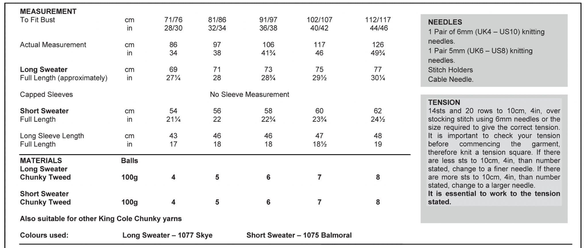 King Cole Ladies Chunky Patterns Home / Knitting Patterns / King Cole Patterns / King Cole Ladies Chunky Patterns / King Cole Long and Short Sweaters Knitted in Chunky Tweed 4040 King Cole Long and Short Sweaters Knitted in Chunky Tweed 4040 King Cole Long and Short Sweaters Knitted in Chunky Tweed 4040 £3.29 RRP: £0.00 In Stock: 0 You Will Earn 3 points with this purchase Free Delivery on orders over £25 Need a hand? Call Us Order before 2PM for same day dispatch Sorry this item is out of stock Pattern: 1 Add to your Wish List Description Size: 71/76 - 112/117cm 28/30 - 44/46in Needle Sizes: 1 Pair of 6mm(UK4) Knitting Needles 1 Pair of 5mm(UK6) Knitting Needles Stitch Holders Cable Needle See image provided for the number of balls of wool required for each garment and the colours that are illustrated in the leaflet. King Cole knitting pattern using King Cole Chunky Tweed yarn. Reviews Customer reviews No reviews left yet Write a review Sort byMost RecentTop Rated No reviews have been left for this product, be the first to leave a review Attributes GTIN: 5015214985949 Brand: King Cole Product Code: 5015214985949