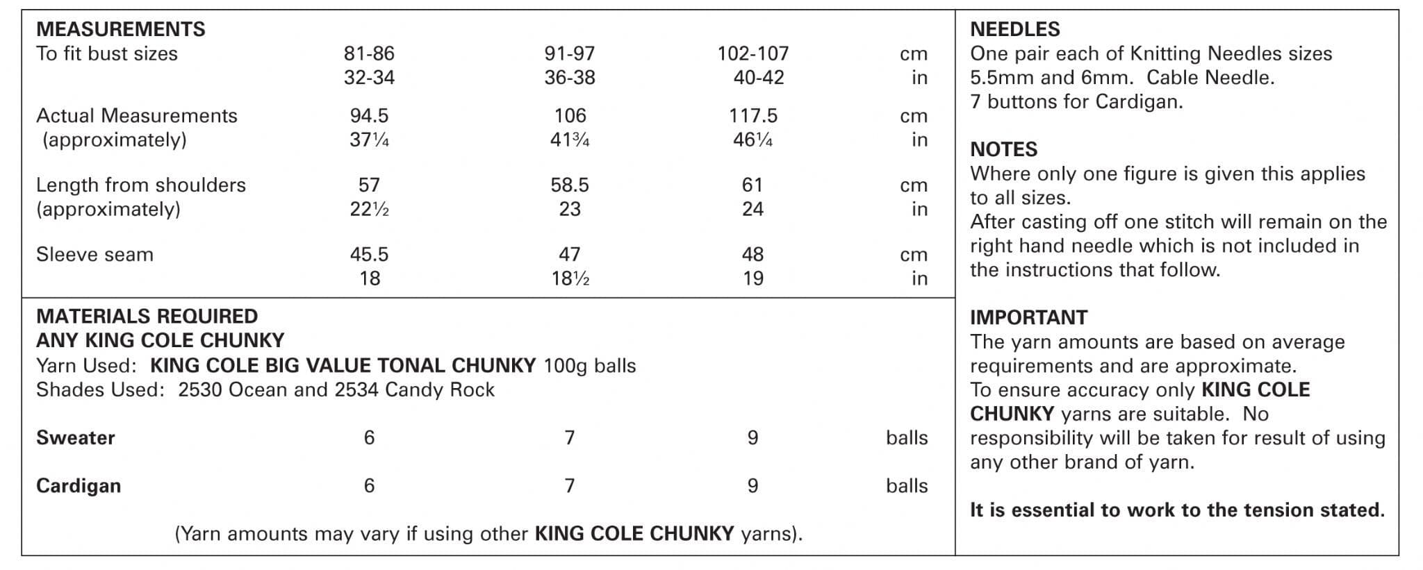 King Cole Ladies Chunky Patterns Home / Knitting Patterns / King Cole Patterns / King Cole Ladies Chunky Patterns / King Cole Sweater & Cardigan Knitted in Big Value Tonal Chunky 4882 King Cole Sweater & Cardigan Knitted in Big Value Tonal Chunky 4882 King Cole Sweater & Cardigan Knitted in Big Value Tonal Chunky 4882 £3.29 In Stock: 0 You Will Earn 3 points with this purchase Free Delivery on orders over £25 Need a hand? Call Us Order before 2PM for same day dispatch Sorry this item is out of stock Add to your Wish List Description Measurements - 32-34, 36-38 & 40-42 inches Amount of yarn required - Sweater: 6[7:9] 100g balls Cardigan: 6[7:9] 100g balls You will also need: One pair of each knitting needles sizes 5.5mm(UK5) and 6mm(UK4). Cable needle. 7 buttons for Cardigan. Reviews Customer reviews No reviews left yet Write a review Sort byMost RecentTop Rated No reviews have been left for this product, be the first to leave a review Attributes GTIN: 5015214210881 Product Code: 5015214210881 Related Products Pony Single Point Knitting Needles - 5.5mm £3.25 Quickview Pony Single Point Knitting Needles - 6mm £3.25 Quickview Pony Cable Needle 6mm £2.55 Quickview