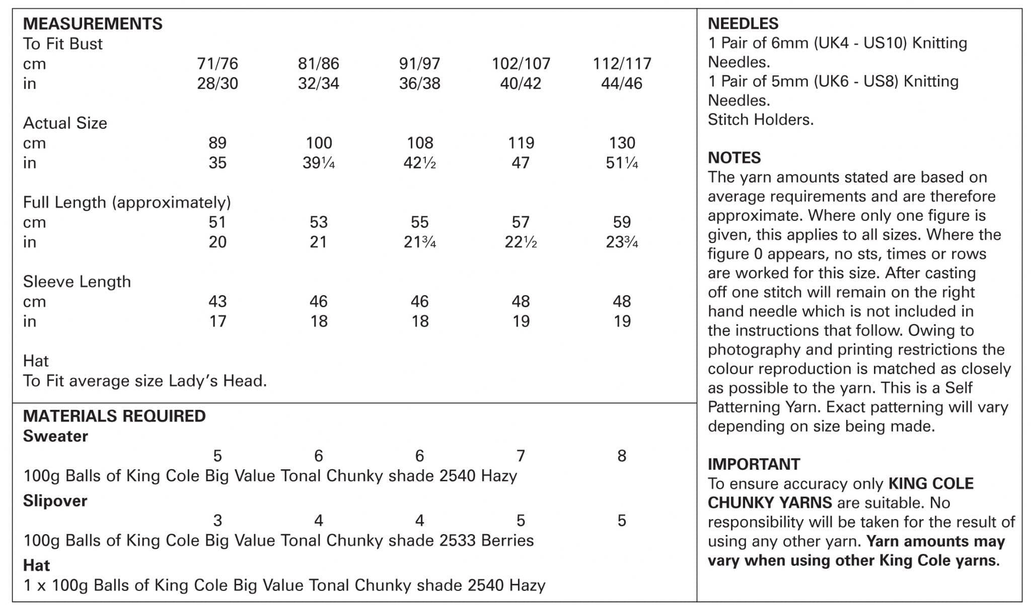 King Cole Ladies Chunky Patterns Home / Knitting Patterns / King Cole Patterns / King Cole Ladies Chunky Patterns / King Cole Sweater, Slipover & Hat Knitted in Big Value Tonal Chunky 5274 King Cole Sweater, Slipover & Hat Knitted in Big Value Tonal Chunky 5274 King Cole Sweater, Slipover & Hat Knitted in Big Value Tonal Chunky 5274 £3.29 In Stock: 1 You Will Earn 3 points with this purchase Free Delivery on orders over £25 Need a hand? Call Us Order before 2PM for same day dispatch Add to your Wish List Description Measurements - 28/30, 32/34, 36/38. 40/42, 44/46 inches Amount of yarn required - Sweater: 5[6:6:7:8] 100g balls Slipover: 3[4:4:5:5] 100g balls Hat: 1 x 100g ball of King Cole Big Value Tonal Chunky shade 2540 Hazy You will also need: 1 Pair of 6mm(UK4) knitting needles. 1 Pair of 5mm(UK6) knitting needles. Stitch Holders Reviews Customer reviews No reviews left yet Write a review Sort byMost RecentTop Rated No reviews have been left for this product, be the first to leave a review Attributes GTIN: 5057886004009 Product Code: 5057886004009 Related Products Pony Single Point Knitting Needles - 5mm £2.95 Quickview Pony Single Point Knitting Needles - 6mm £3.25 Quickview Pony Large Stitch Holder £2.70 Out of stock