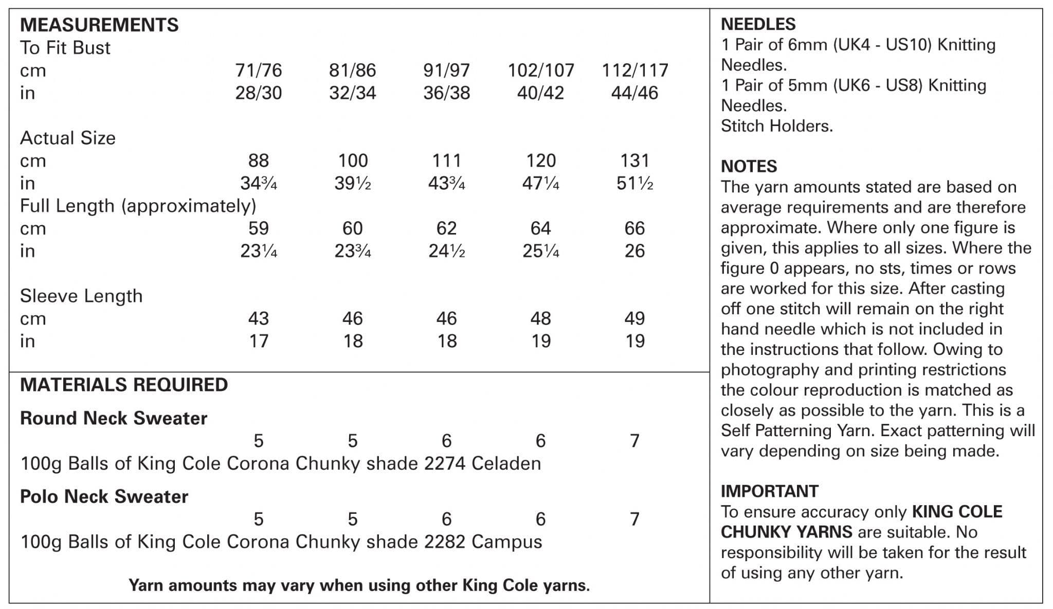 King Cole Ladies Chunky Patterns Home / Knitting Patterns / King Cole Patterns / King Cole Ladies Chunky Patterns / King Cole Sweaters Knitted in Corona Chunky 5277 King Cole Sweaters Knitted in Corona Chunky 5277 King Cole Sweaters Knitted in Corona Chunky 5277 £3.29 In Stock: 0 You Will Earn 3 points with this purchase Free Delivery on orders over £25 Need a hand? Call Us Order before 2PM for same day dispatch Sorry this item is out of stock Add to your Wish List Description Measurements - 28/30, 32/34, 36/38, 40/42, 44/46 inches Amount of yarn required - Round Neck Sweater: 5[5:6:6:7] 100g balls of King Cole Corona Chunky shade 2274 Celaden Polo Neck Sweater: 5[5:6:6:7] 100g balls of King Cole Corona Chunky shade 2282 Campus You will also need: 1 Pair of 6mm(UK4) knitting needles. 1 Pair of 5mm(UK6) knitting needles. Stitch Holders Reviews Customer reviews No reviews left yet Write a review Sort byMost RecentTop Rated No reviews have been left for this product, be the first to leave a review Attributes GTIN: 5015214916547 Product Code: 5015214916547 Related Products Pony Single Point Knitting Needles - 5mm £2.95 Quickview Pony Single Point Knitting Needles - 6mm £3.25 Quickview Pony Large Stitch Holder £2.70 Out of stock